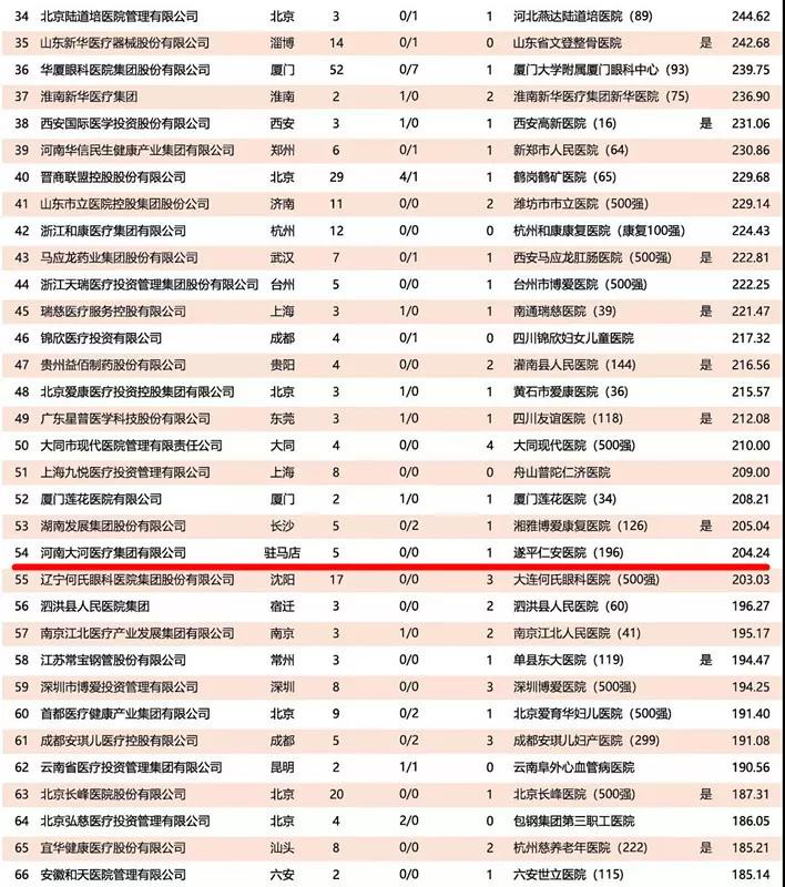 近日,香港艾力彼医(yī)院管理(lǐ)研究中(zhōng)心发布“2018届社会办(bàn)医(yī)·医(yī)院集团100强”榜单,集团成员企业河南大河医(yī)疗集团有(yǒu)限公(gōng)司位居第54位。在同期发布的“2018届社会办(bàn)医(yī)·民(mín)营医(yī)院500强”榜单中(zhōng),大河医(yī)疗旗下的遂平仁安(ān)医(yī)院位居第196位。